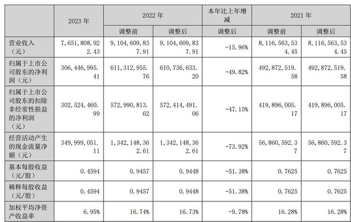 宝武镁业此前发布2023年年报显示:2023年,公司实现营业收入7,651,808,922.43元,与去年同期相比下降15.96%,归属于上市公司股东的净利润306,446,995.41元,与去年同期相比下降49.82%。归属于上市公司股东的扣除非经常性损益的净利润为302,524,460.99元,与去年同期相比下降47.15%。因公司产品销售价格下降,毛利率下降,业绩同比下降。主营业务收入7,368,322,967.40元,占总营业收入的96.30%,其他业务收入283,485,955.03元,占总营业收入的3.70%;国内市场营业收入6,321,481,184.88元,国外市场营业收入1,330,327,737.55元,占营业收入比例分别为82.61%和17.39%。