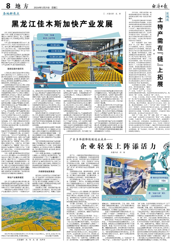 今年一季度,佳木斯规上工业增加值同比增长9.9%,居黑龙江省各地市首位。“佳木斯将持续推进‘千百十’产业量级提升工程,促进传统产业转型升级,培育壮大战略性新兴产业,超前谋划未来产业,加快工业数字化、智能化、绿色化转型,为推动老工业基地转型发展汇聚新动能。”佳木斯市工业和信息化局局长国宏利说。
