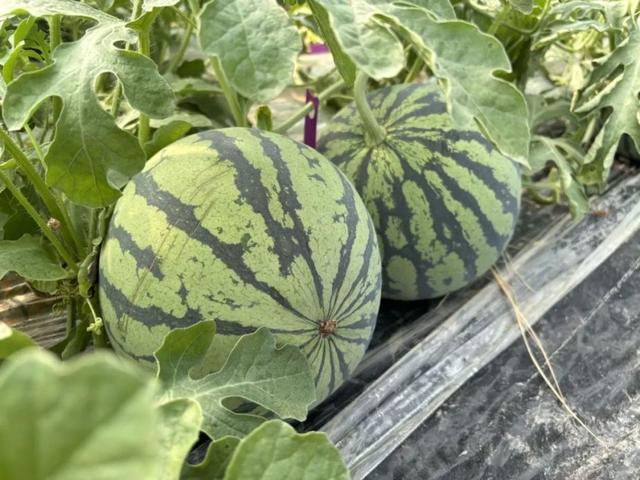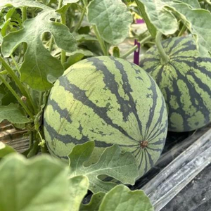 5月中旬,记者来到南汇8424西瓜的主产区之一浦东新区书院镇。在上海田博瓜果专业合作社一处基地内,从一排排瓜棚中间走过去,不用进棚,就能看到一个个圆溜溜、有着油亮黑绿花纹的西瓜,从绿色藤蔓下“探出脑袋”。