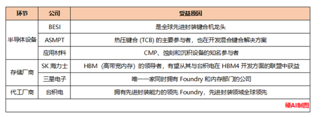 值得注意的是,该技术目前仍然在开发阶段,花旗预测会在2027年迎来爆发。作为先进封装未来的趋势,3D封装中新增的‘混合键合’技术,将为半导体设备厂商(键合机厂商等)、存储供应商和晶圆代工厂商带来新的机遇。
