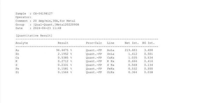 为检测出小金块沾上的杂物成分,记者将其送到了专业的检测机构“科学指南针”,检测报告显示,金块内锡元素的含量约2.2%。