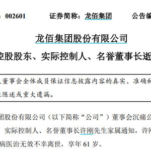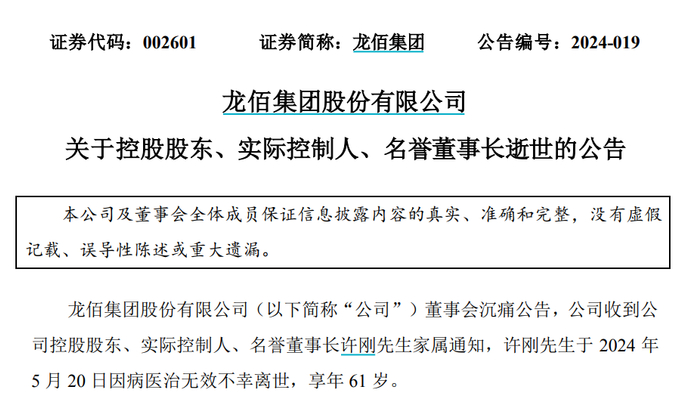 5月21日晚间,龙佰集团(002601)董事会沉痛公告,公司收到公司控股股东、实际控制人、名誉董事长许刚家属通知,许刚先生于2024年5月20日因病医治无效不幸离世,享年61岁。