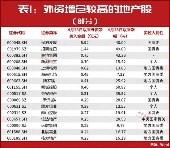 具体到个股来看,外资还是偏爱头部公司,其增仓前两家都是央企背景的头部公司,如保利发展、招商蛇口,这两家公司4月25日以来涨幅都超过了40%。