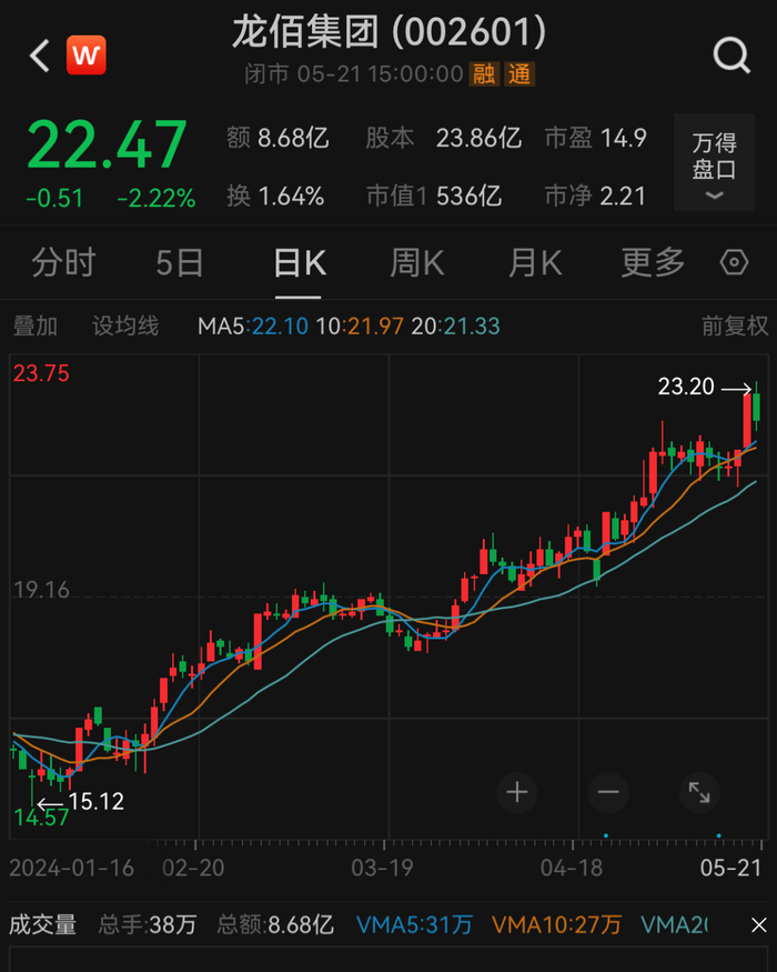 截至5月21日收盘,龙佰集团每股报22.47元,年内股价上涨超31%。公司最新市值达536亿元。
