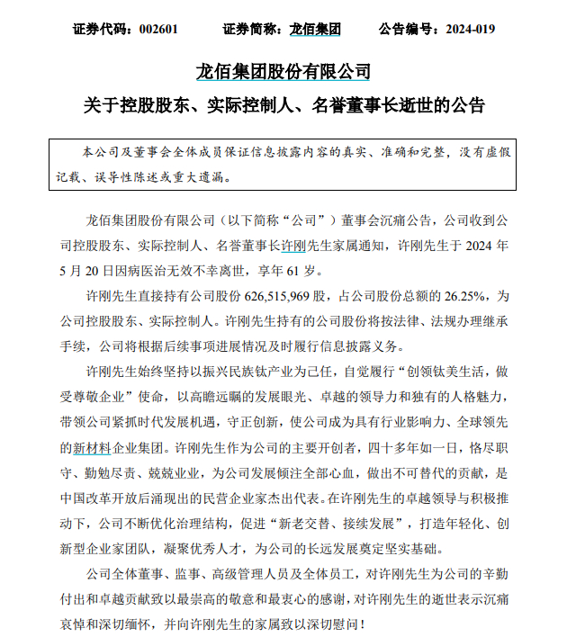 根据龙佰集团董事会沉痛公告,公司收到控股股东、实际控制人、名誉董事长许刚家属通知,许刚于2024年5月20日因病医治无效不幸离世,享年61岁。