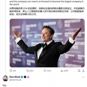 【环球网科技综合报道】5 月 21 日消息,特斯拉首席执行官埃隆・马斯克关注的账号“Teslaconomics”发帖表示:“如果埃隆获得25%的投票权,特斯拉在德克萨斯州重新注册成立,并且薪酬方案获得批准,那么人工智能和机器人技术就会留在特斯拉内部,公司就能继续前进,成为全球最大的公司。”马斯克回帖“Yes”表示认同。