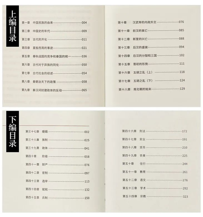 下册以中国文化史为血肉,“周赡各领域”,涵盖婚姻、族制、财产、实业、教育等18章文化专题知识,佐以精挑细选的传世文物图27幅,新增图注3000余字,图文并茂,将中国五千年文化娓娓道来。