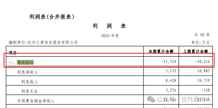 2023年不少信托公司惨淡经营,杭工商信托是其中之一,不仅净利润连续2年亏损,就连营业收入都是负值的,而且是唯一一家。