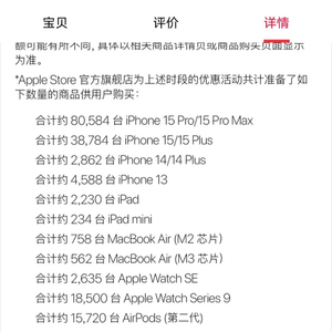 记者注意到,Apple Store官方旗舰店显示,5月20日20点至5月28日,购指定产品最高可省2300元。参与上述时段的优惠活动的商品包括iPhone 15系列约11.94万台,其中iPhone 15 Pro、iPhone 15 Pro Max合计约80584台,iPhone 15、iPhone 15 Plus合计38784台。