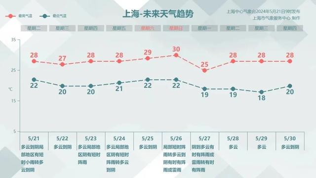 但与上周不一样的是,本周降水天气增加,工作日多短时小雨或短时阵雨,周日及下周一申城还有一次阵雨或雷雨天气过程,本周气温较为稳定,最低20—22℃,最高27—30℃,就是初夏那个味!