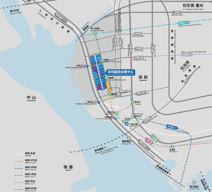 深圳国际会展中心(宝安)位于深圳市宝安区福海街道展城路1号,紧邻深圳宝安国际机场,毗邻福永码头,紧挨广深沿江高速,接驳城轨,可通过多种交通方式轻松便捷抵达展馆。