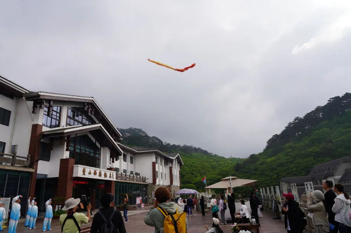 当直播组一行来到排云型旅酒店时,高山野型市集正在进行中,好吃的、好玩的,令人眼花缭乱、流连忘返。尤其是徽州鱼灯和非遗漆扇的展示,为青翠静谧的山林增添了斑斓绚丽的色彩。而在不远处的西海饭店,直播一行还欣赏了天然氧吧中的八段锦,以及热闹有趣的变脸表演和充满现代科技“飞天凤凰”航模表演。主播蓓蓓表示:“观天下山,不如观黄山。黄山集天下名山之所长,是疗愈身心的最佳去处。”