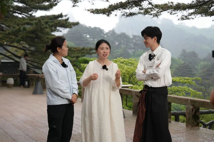经过一天的攀登,傍晚时分,直播组一行来到黄山北海景区。在狮林大酒店,通过直播网友们还感受了山巅旅拍摄影的魅力。在高山美宿狮林崖舍,直播一行在主理人的讲述中了解了“崖舍六古”(古树、古塔、古石门、古泉、古道、古庙)的历史文脉,并欣赏了雅致的宋代点茶。
