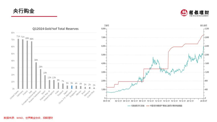 洪晓峰特别提到,中国央行从2022年的11月开始新一轮周期黄金增持,到今年的4月份已经是连续第18个月增持了。回顾历史,中国央行每次增持黄金往往与金价上涨相伴。目前我国黄金占到整体外汇储备的比例也只有不到5%,相较于整体的全球央行15%的水平,还有很大的一个距离。