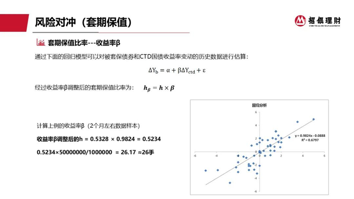 王舟:用国债期货去给现货做对冲,无论如何都要面对基差风险,我们在实际操作中,一般用收益率Beta的一个回归的测算,或者干脆用一个波动率,就是我们比如说要套保资产的过去一段时间的波动率情况和我们套保工具,这里也就是指国债期货和我们国债期货的过去一段时间的波动率情况,用它的波动率这个比去做一个对冲比例的参考。