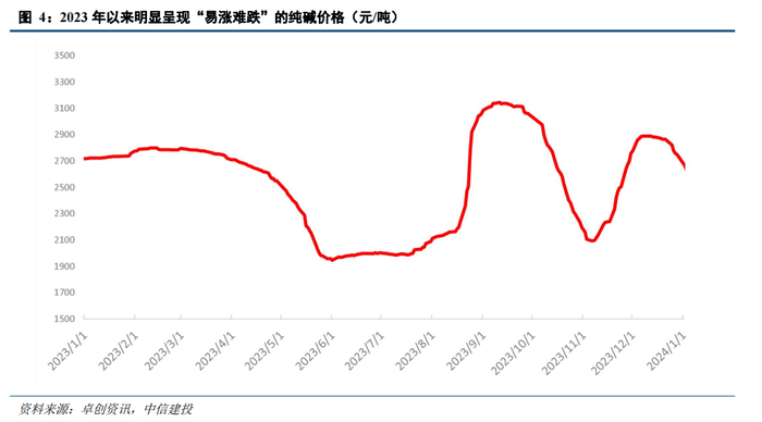 事实上,在2023年我们已经看到了这样的情况,随着远兴的阿拉善一期项目投产,龙头地位确立,纯碱价格也呈现明显的易涨难跌: