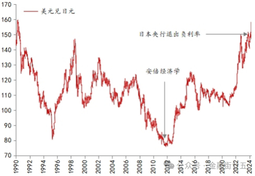 年初,我们曾预计2024年市场的大变化之一就是日元汇率走强,理由是,伴随多年通缩局面的扭转,日本央行货币政策将开始转向,然而,就在日本央行于3月份提早结束负利率政策之后,日元汇率却呈现快速贬值态势,4月29日美元兑日元汇率一度突破160,较年初140累计贬值幅度超过了14%。