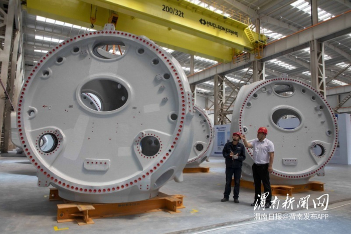 5月21日,质检工人在渭南经开区风电装配“双碳”产业示范园项目主机厂房,对生产车间风电机组进行检查。目前,该项目主机厂房及附属办公楼于5月7日已完工并交付运达投产,风力发电叶片制造厂房、辅助用房等处于桩基施工阶段。