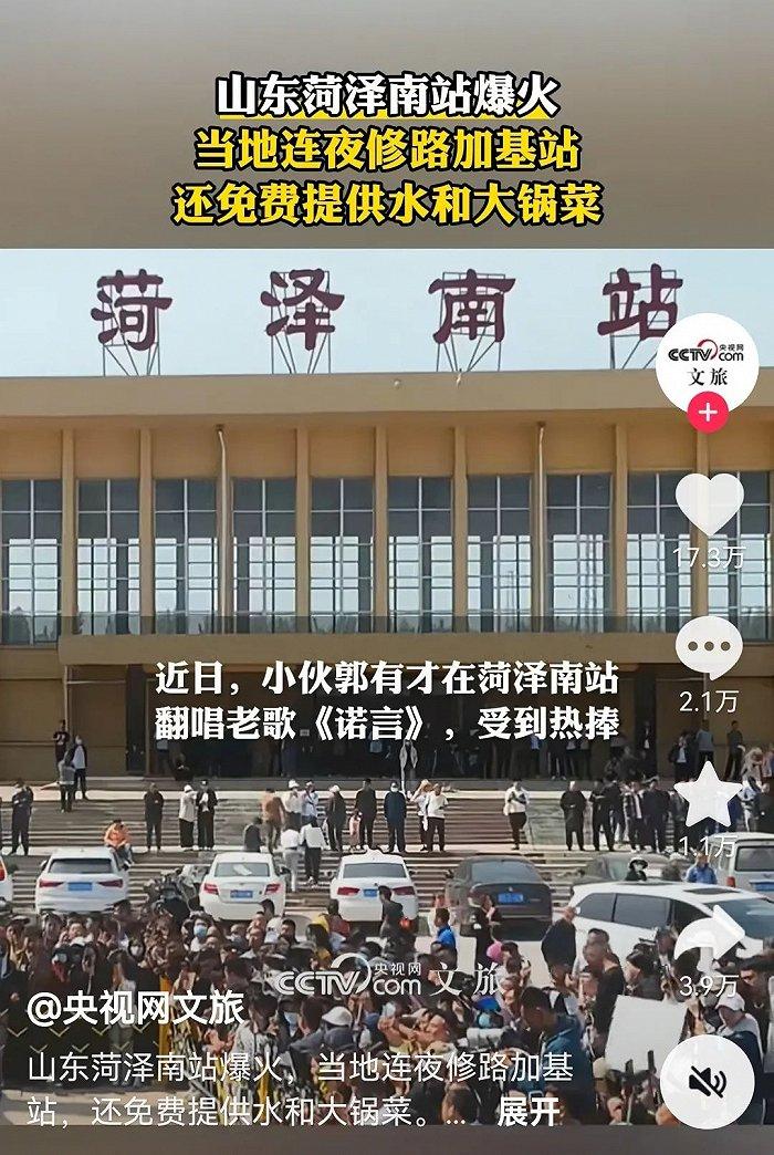 这并不是菏泽第一次被互联网流量击中。“大衣哥”也是菏泽人;一句山东方言口音"山东菏泽曹县666我们勒宝贝"的喊麦,曾引发全网效仿,令菏泽下属县曹县一夜之间成为网红、号称 "宇宙中心”。另外,“2023年靠卖汉服年入70亿元”也让曹县又火了一把。