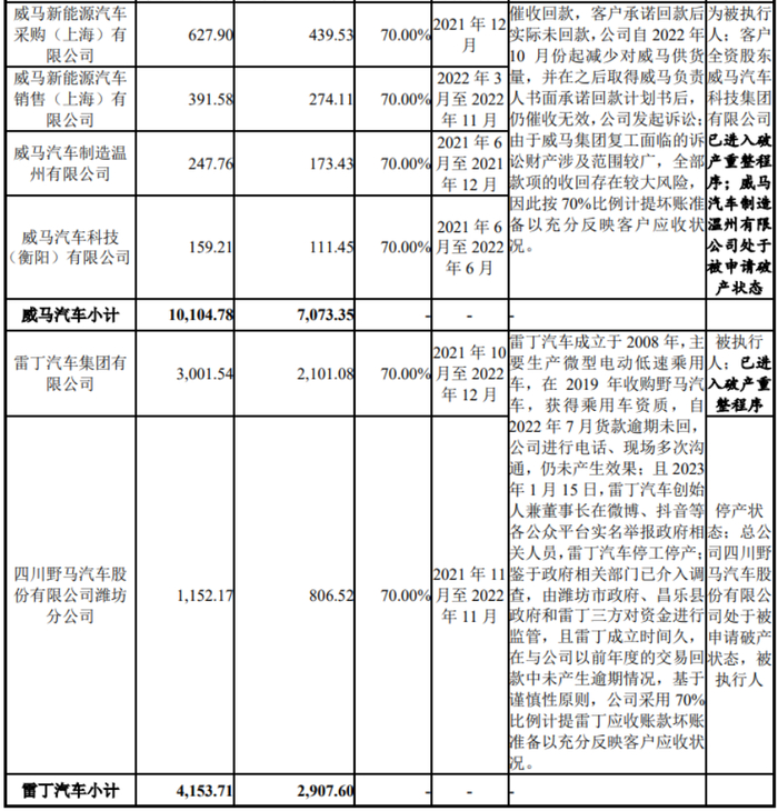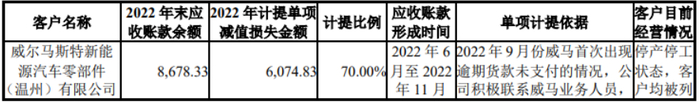 截至2022年末,英搏尔对威马汽车合计应收账款余额合计为10,104.78万元,计提单项减值损失金额为7,073.35万元,英搏尔表示,由于威马集团复工面临的诉讼财产涉及范围较广,全部款项的收回存在较大风险,因此按70%比例计提坏账准备以充分反映客户应收状况。