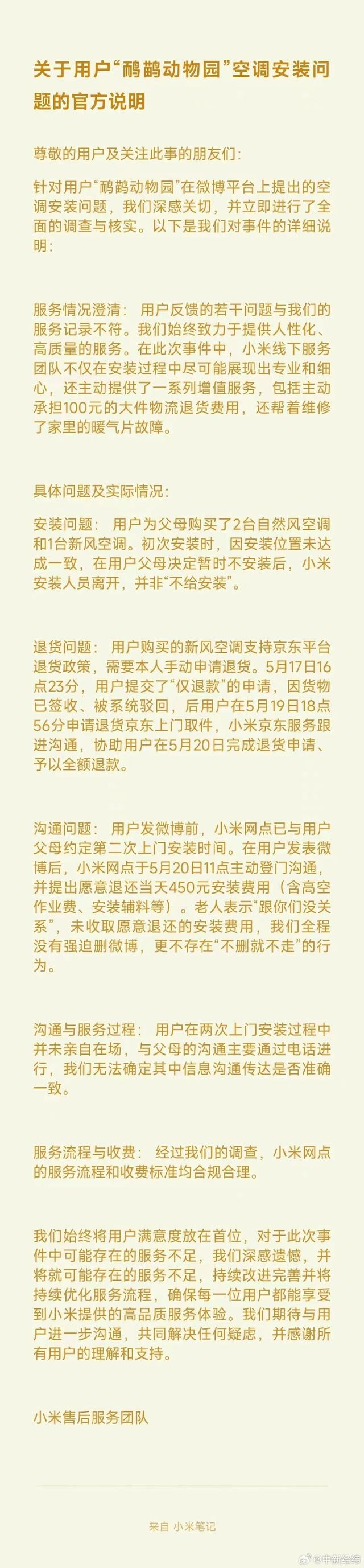 近日博主@鸸鹋动物园 发布动态称,5月12日为父母下单购买3台小米空调,但直到19日仍没有空调用。博主表示,安装空调的当天,安装师傅表示其中1台空调无法安装,建议退货便离开了。后续找客服沟通过程中,该博主再次下单买了1台空调,希望能有安装师傅上门安装,结果直到19日,客厅里放着 4 台空调,8 个大箱子,没人给安,也没人给退。对此,小米服务发布说明回应该次事件:用户反馈的若干问题与我们的服务记录不符。用户初次安装时,因安装位置未达成一致,在用户父母决定暂时不安装后,小米安装人员离开,并非“不给安装”。用户发微博前,小米网点已与用户父母约定第二次上门安装时间。
