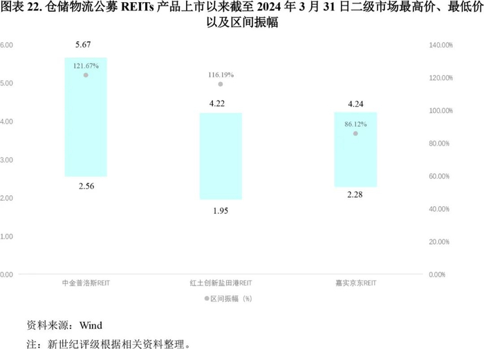 从波动幅度来看,截至2024年3月31日,中金普洛斯REIT产品价格波动最大,区间振幅高达121.67%,新发行的嘉实京东REIT区间振幅最小,为86.12%。
