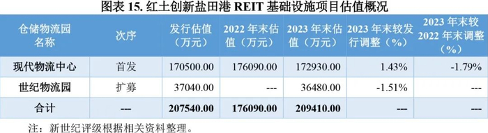 根据评估报告,该基础设施项目截至2023年末的估值合计为20.94亿元,收益法折现率假设为7.00%,估值单价为5397元/平方米。两个基础项目公司估值较上年均有所下调,现代物流中心主要是由于预计租金由40.55元/平方米/月下降至40.3元/平方米/月;世纪物流园虽然租金有所上调,但第6-10年的租金增长率由5%调减至3%,导致估值下降。