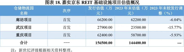 根据评估报告,截至2023年末,嘉实京东REIT下三个仓储项目估值均有所下降,其中武汉项目降幅高达15.77%,主要系续签合同租金从32.40元/平方米/月下调至28.98元/平方米/月,廊坊项目和重庆项目估值下降或因预期长期增长率下调所致。考虑到重庆项目当前租约将于2024年末到期,续约价格具有一定不确定性,后续项目估值或将承压。