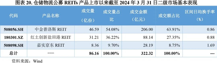 截至2024年3月31日,3支仓储物流公募REITs产品总成交量为86.16亿份,总成交金额为322.32亿元,其中占比最大的均为中金普洛斯REIT,分别为54.08%和63.91%。市场活跃度方面,嘉实京东REIT最为活跃,日均换手率为1.69%。