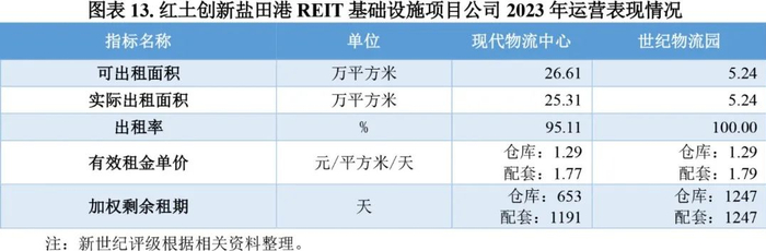 截至2023年末,现代物流中心出租率为95.11%,租赁期限在1-15年之间,最长租赁期限到期日为2037年6月30日,租赁面积占比最大的客户为深圳市深圳港集团有限公司(简称“深圳港集团”),租赁面积11.63万平方米,占可出租面积的44%。同期末,世纪物流园项目出租率为100.00%,为深圳市通捷利物流有限公司所整租,租赁面积5.24万平方米,租赁期限到期日为2027年5月31日。