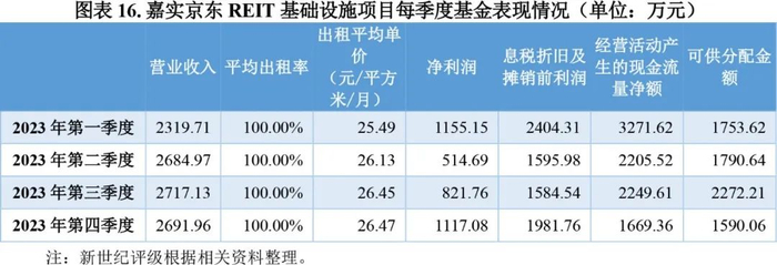 根据嘉实京东REIT发布的季度报告,自2023年1月11日该基金成立以来,季度收入基本稳定在2300万元以上,主要来自于项目公司的租赁收入,另有物业管理服务费收入和其他收入。其项目均出租给京东的相关关联企业,均为满租状态。截至2023年12月31日,其出租平均单价为26.47元/平方米/月。2023年度的净现金流分派率[10]为4.86%。
