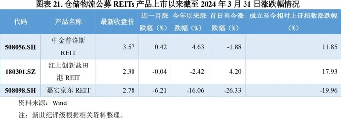 从产品收益率来看,截至2024年3月31日,除红土创新盐田港REIT 外,其余2支仓储物流公募REITs产品相对于成立日而言均呈亏损状态,其中嘉实京东REIT亏损最大,跌幅高达26.33%。