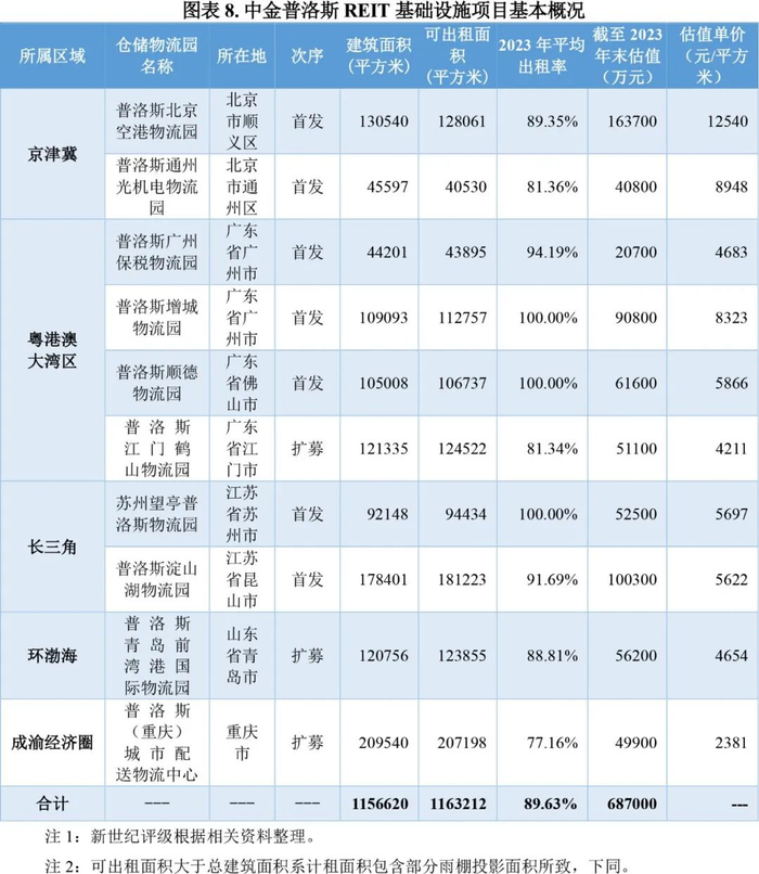 截至2023年末,该基金持有的基础设施资产组合由10个仓储物流园组成,分布于京津冀、长三角、环渤海经济区、粤港澳大湾区和成渝经济圈等核心商品集散地,物流交通便利,周围工业厂房、物流仓库群聚,产业聚集度高,区域仓储物流租赁市场需求旺盛,建筑面积合计约1156620平方米,可出租面积合计约1163212平方米,其中首发所涉及的基础设施项目共7个,建筑面积合计约704988平方米,可出租面积合计约707637平方米,2023年6月完成扩募的基础设施项目共3个,建筑面积合计约451631平方米,可出租面积合计约455575平方米。具体如下表所示: