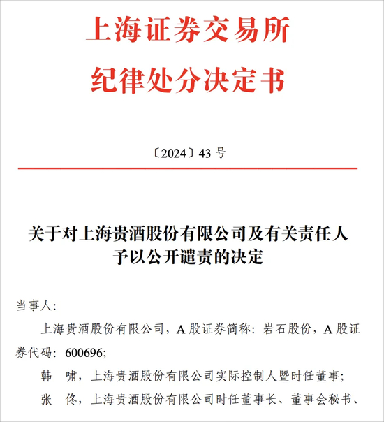上交所表示,岩石股份未按照相关规定对上述代偿代付费用予以会计处理,导致岩石股份2017年、2018年、2019年、2020年年度报告存在虚假记载。鉴于上述违规事实和情节,根据有关规定,上交所作出如下纪律处分决定:对上海贵酒股份有限公司及实际控制人暨时任董事韩啸,时任董事长、董事会秘书、董事张佟,时任财务总监孙瑶予以公开谴责。