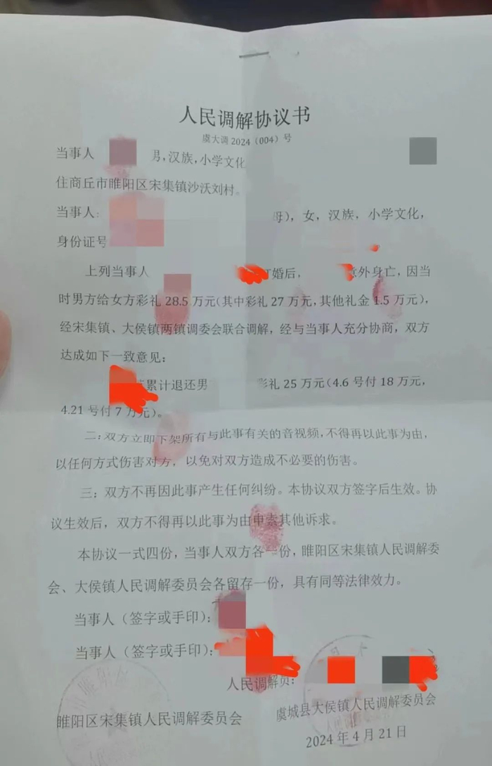 彤彤头七当天,邢亮给周蓉打电话协商退彩礼。第二天中午,周蓉跟邢亮父子见面时称,因彤彤抢救和安葬花了几万元,她手里只剩下183000元。在两个媒人的见证下,周蓉先退还了18万元彩礼,并签字、摁手印。