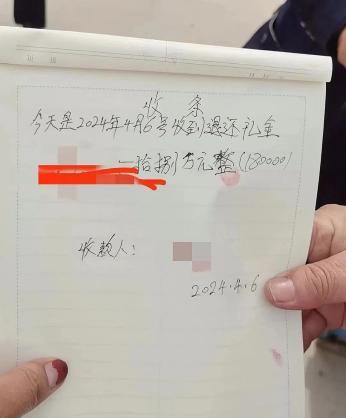张民还透露,女方媒人李颖也曾收到过一笔介绍费。当时邢亮父亲将5200元发给周蓉,让她转交给李颖,“女方扣了她400元,只发给她4800元。”这笔钱最终也被男方收回。