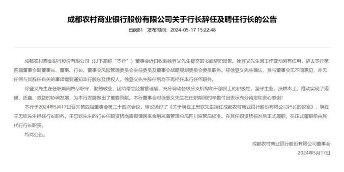 此前在5月13日,成都银行召开了第七届董事会第五十次(临时)会议,审议通过了《关于聘任徐登义先生为成都银行股份有限公司行长的议案》,同意聘任徐登义为成都银行行长,任职资格经监管机构核准后正式任职。