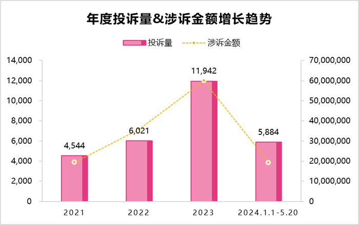 据中国电子商会旗下的消费服务保障平台消费保相关数据显示,2021-2023年间,视频平台投诉量不断上升,2023年总投诉量达到11,942件,同比增长98.34%。2024年以来,投诉量持续增长,消费保共收到视频平台投诉5,884件,涉诉金额高达1,927万。