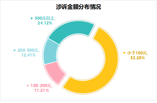 消费保平台的数据显示,视频平台相关投诉中,涉诉金额小于100元的投诉量占比高达52.26%,其次是金额大于500元的投诉,占比24.12%。