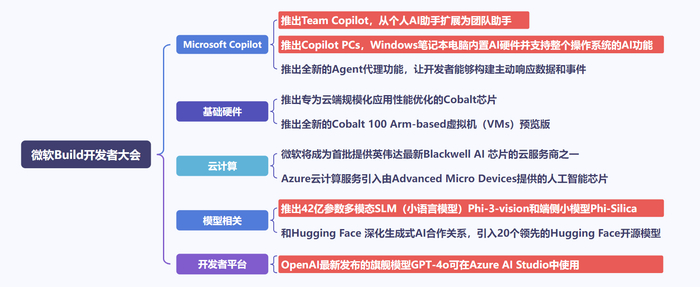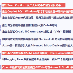 5月22日凌晨, 2024微软Build大会拉开帷幕,微软一口气宣布了50多项AI能力更新,覆盖GPT-4o上云、自研Cobalt芯片、团队版Copilot、SOTA小模型等多个方面。