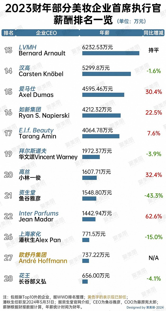 从该榜单可见,2023财年美妆CEO薪酬整体呈上涨,LVMH首席执行官Bernard Arnault却跌出了薪酬Top10。