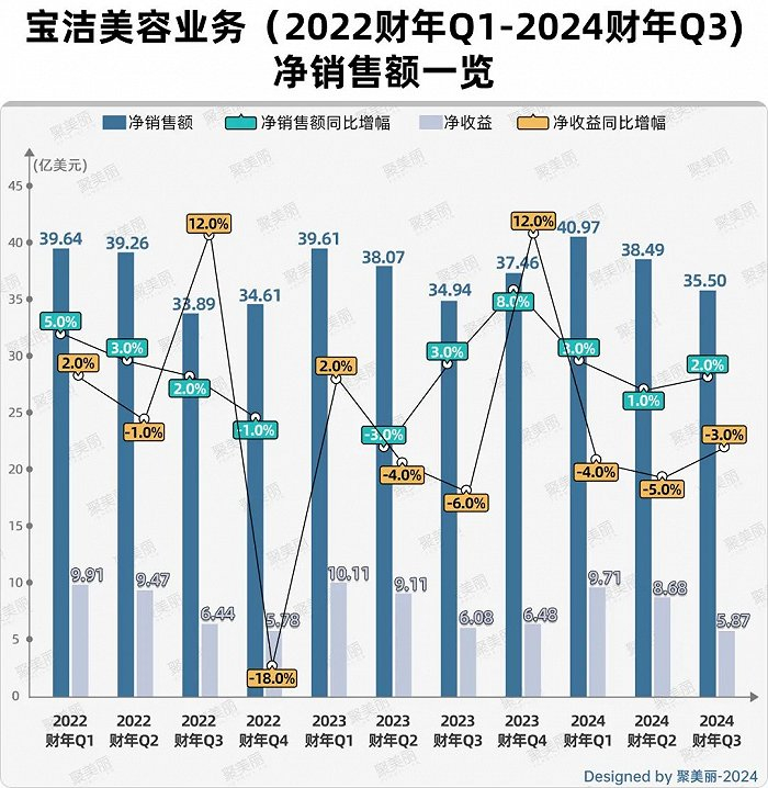 虽说如此,Jon R. Moeller任CEO期间,宝洁美容业务的发展较为低迷。2022财年Q1-2024财年Q3(2021年7月-2024年3月),宝洁美容业务增速放缓,最近3季度净收益连续下滑。