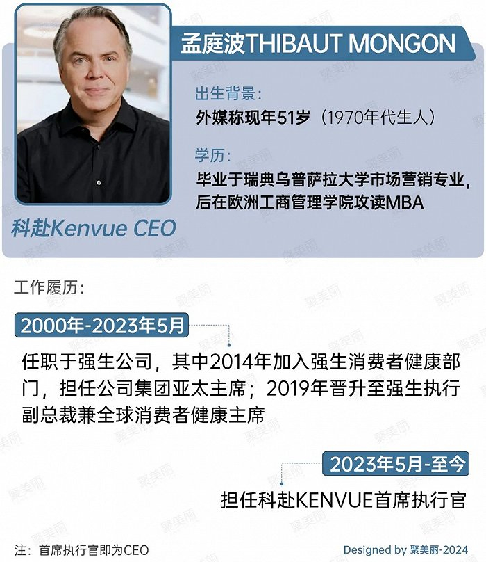 在就任CEO之前,孟庭波Thibaut Mongon前东家为强生。他在2000年-2023年5月期间,就职于强生;2014年后深耕于大健康产业——加入强生消费者健康部门,担任集团亚太主席;2019年晋升至强生执行副总裁兼全球消费者健康主席。