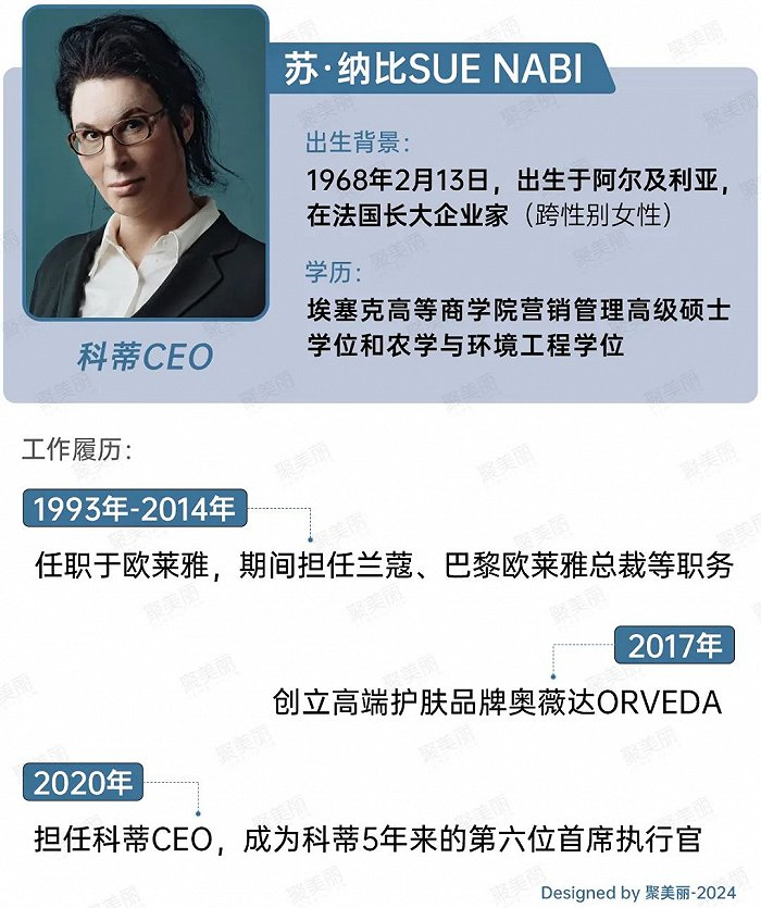 经历了数十年打工人生涯后,苏·纳比Sue Nabi于2017年创立了高端护肤品牌奥薇达Orveda,该品牌在2021年与科蒂达成代理协议,并成为旗下三大主要护肤品牌之一(其他两个为兰嘉丝汀、肌肤哲理)。