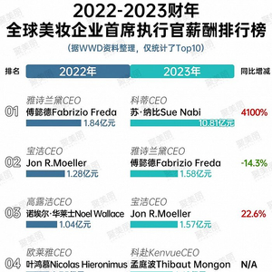 从《2023财年全球美妆企业首席执行官薪酬排行榜》可知,去年整体为涨薪的一年,特别是美国公司高管仍是全球美妆企业中的高收入人群。