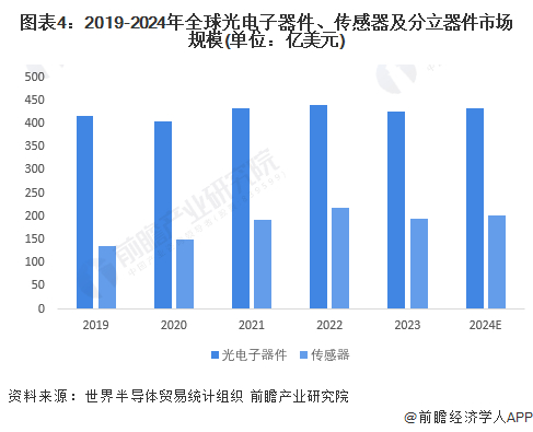 光电子器件和传感器市场也开始呈现回暖趋势。据世界半导体贸易协会预测,2024年全球光电子市场规模将达到433.24亿美元,同比上涨1.74%;传感器市场规模为201.27亿美元,同比上涨3.66%。