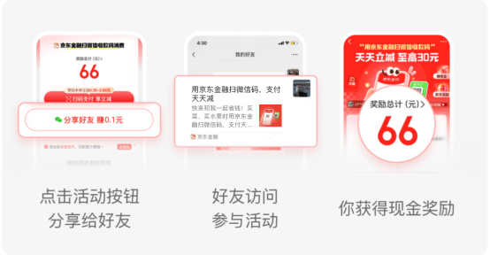 “立减”不过瘾的话,可以参与“分享赚现金”,说不定一不小心就拿到顶配奖励!即日起至6月30日,在“京东金融扫微信收款码”的活动页面,点击按钮“分享好友 赚现金”或者“分享到朋友圈”,好友点击链接参与活动并扫微信支付码完成一笔,分享活动的用户即可获现金奖励。