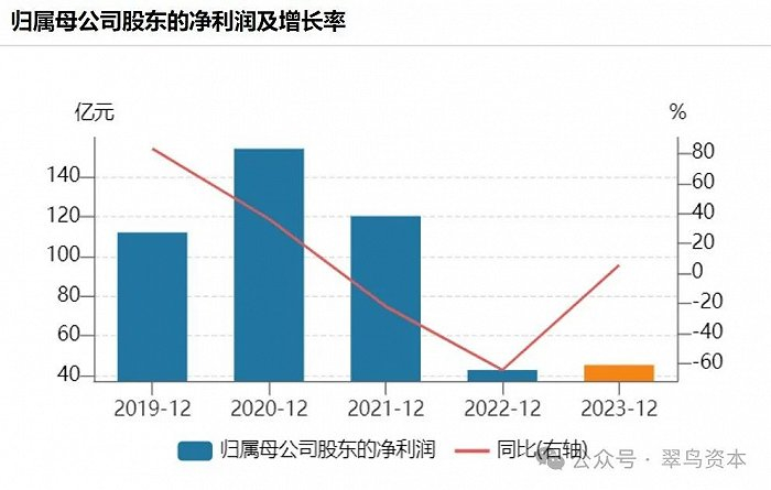 不过,尽管公司总收入略有下降,但净利润确实实现了增长,2023年净利润45.27亿元,同比增长5.53%,其中,扣非净利润43.88亿,同比大增40.35%。