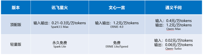 对比来看,科大讯飞此次调整讯飞星火大模型的定价更具竞争力,不仅在业界推出首个“永久免费”的版本,更在顶配的版本上实现了更低的价格。以输出价格为例,讯飞星火 Max API价格低至0.21元/万Tokens,相比百度文心一言ERNIE-4. 0和阿里通义千问Qwen-Max 1.2元/万Tokens的价格,讯飞星火定价为百度阿里的五分之一。