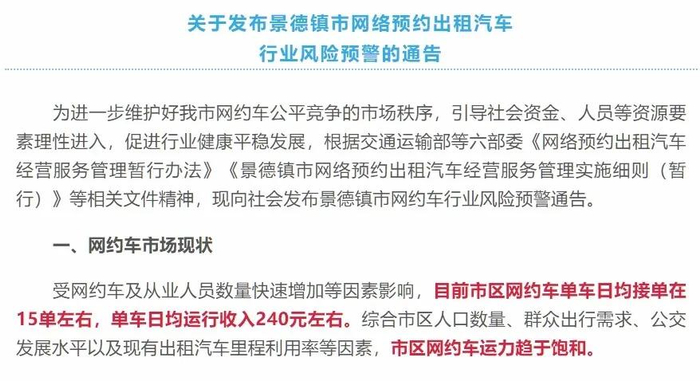 5月20日,江西景德镇市交通运输局发布网约车行业风险预警通告。通告称,受网约车及从业人员数量快速增加等因素影响,目前景德镇市区网约车单车日均接单在15单左右,单车日均运行收入240元左右。综合市区人口数量、群众出行需求、公交发展水平以及现有出租汽车里程利用率等因素,市区网约车运力趋于饱和。